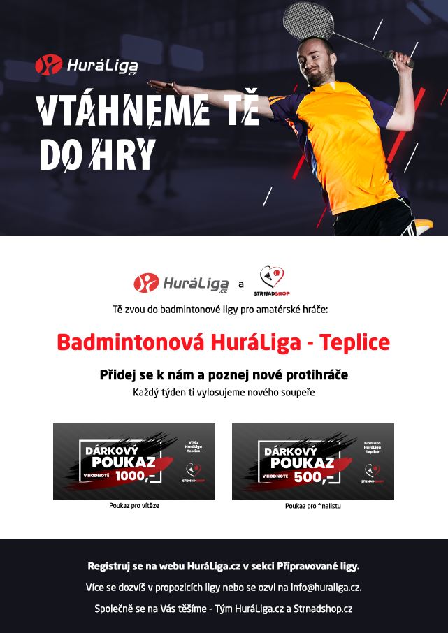 Hurá na HuráLigu v badmintonu v Teplicích. Startujeme nový turnaj 20. ledna 2019 a to švýcarským systémem na 10 kol /zápasů/ pro všechny nadšence počínaje mírně, středně a hodně pokročilých hráčů /kromě profíků/. Veškeré info a přihlášku naleznete na HuraLiga.cz.