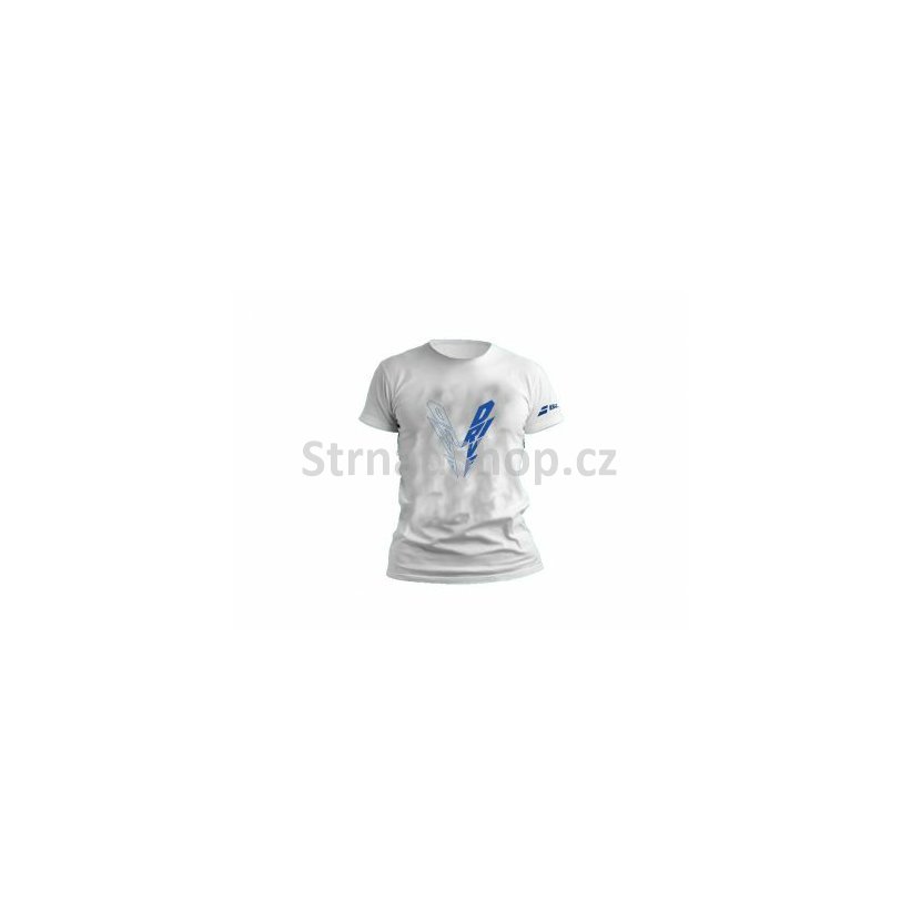 Pánské tričko s krátkým rukávem Babolat bílé barvy s logem na rukávu a potiskem Pure Drive na hrudi.